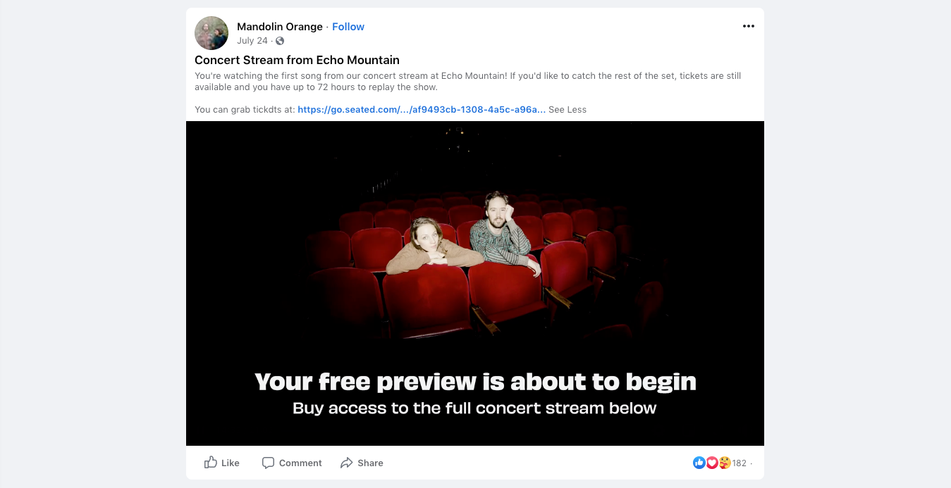 For example, for Mandolin Orange's live stream, we simulcasted the first song to their YouTube and Facebook page as a "free preview," and then drove everyone into the paid stream to watch the rest of the event. Hundreds of additional purchases came in following that quick one-song preview, even after the stream had already started.