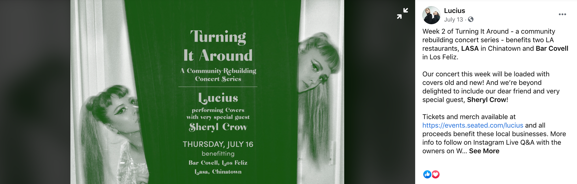 To-date, 83% of the artists we've partnered with have chosen to donate at least a portion of their live stream proceeds to charitable causes. Through these live streams, artists have championed issues ranging from racial justice to helping small local businesses like restaurants and bookstores. For example, in a recent weekly live stream series, Lucius spotlighted small businesses in LA facing financial hardships due to COVID-19. The band ultimately raised over $70,000 for their community re-building initiative.